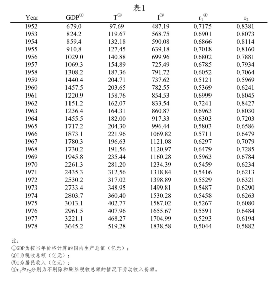 我所使用的国内生产总值和税收数据来自《新中国六十年来统计资料汇编》;居民收入数据来自艾春荣、汪伟(2008)的计算,他们根据《中国统计年鉴》与《新中国55年统计资料汇编》中支出法GDP数据,将居民消费数据和储蓄数据相加,得到居民收入。