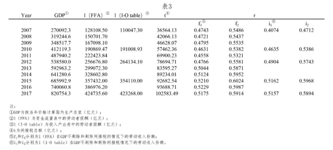 这一阶段,我也使用了投入产出表中的劳动者报酬数据来计算劳动收入份额,但是由于我国的投入产出表间隔1-2年才更新一次,数据的连续性不及资金流量表。因此,表4中采用的仍然是以资金流量表数据计算的劳动收入份额。