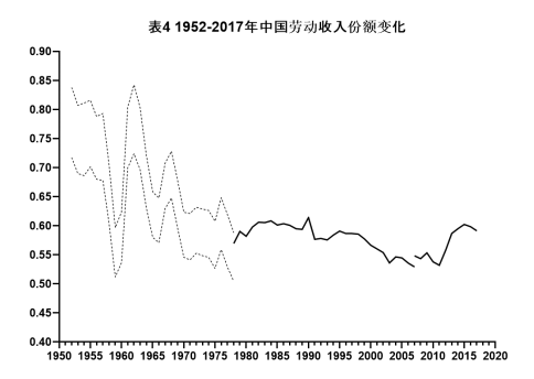 此阶段数据上存在的困难最为明显,具体表现为两个方面:(1)国家没有公布投入产出表(I-O table)或者资金流量表(FFA),导致无法获得劳动者报酬的具体数据。我采取的解决办法是:使用居民收入(=工资性收入+经营性收入+财产性收入+其他)替代劳动报酬。考虑到1978年以前公有制经济在整体经济中占据着绝对地位,无论城乡,经营性、财产性和其他收入的比重占居民收入的比重都比较小,工资在居民收入中居于主体地位。因此,使用居民收入来代替劳动收入的误差当可接受。(2)国家税收统计口径较为笼统,占税收很大比例的工商税收和农业税收中都同时包含了直接税和间接税,因此无法得到明确的间接税数据。我采取的解决办法是:同时计算出扣除和不不扣除税收总额两种情况下的劳动收入份额,真实的劳动收入份额应在两者之间。因此,这一阶段的劳动收入份额仅仅是一个预测区间,在表4中以两段分别代表扣除和不扣除税收总额的虚线标示。