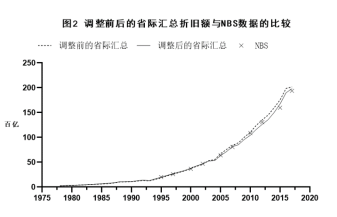 由省际折旧额汇总得到全国折旧额近似值的方法,其优点在于避免了不准确的折旧率假设带来的误差,其缺点在于将省际汇总数据作为全国数据不符合我国国民经济核算的制度。图2显示了调整后的省际汇总折旧额与NBS有数据公布的年份的对比,可以看到,二者十分接近,这说明由省际折旧额推算全国折旧额的思路是可行的,对省际汇总折旧额的调整也是富有成效的。
