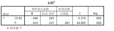 在取得了产出、资本和劳动力的数据后,使用SPSS对(1)式进行OLS回归,得到系数