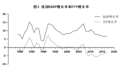 带入即可得到我国1979-2017年的TFP序列(见表4)。纵观这39年的数据,TFP增长率平均值为-0.36%,有16个年份为正增长,23年为负增长,极大值为5.9%(1984年),自2008-2017年,增长率持续为负,如按此理解,我国尚未摆脱严重依赖资本投入实现经济增长的发展阶段,技术进步对经济增长的贡献较小的情况并未得以改观。图3表现了我国实际GDP增长率与TFP增长率的密切联系。